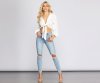 Casual chic is the way to go with this adorable tie front top. It features a long lapel collar, long sleeves with elastic cuffs, a tie front closure creating a deep V neckline, and a cropped hem. The top is composed of a lightweight, airy textured woven fabric with no stretch.