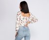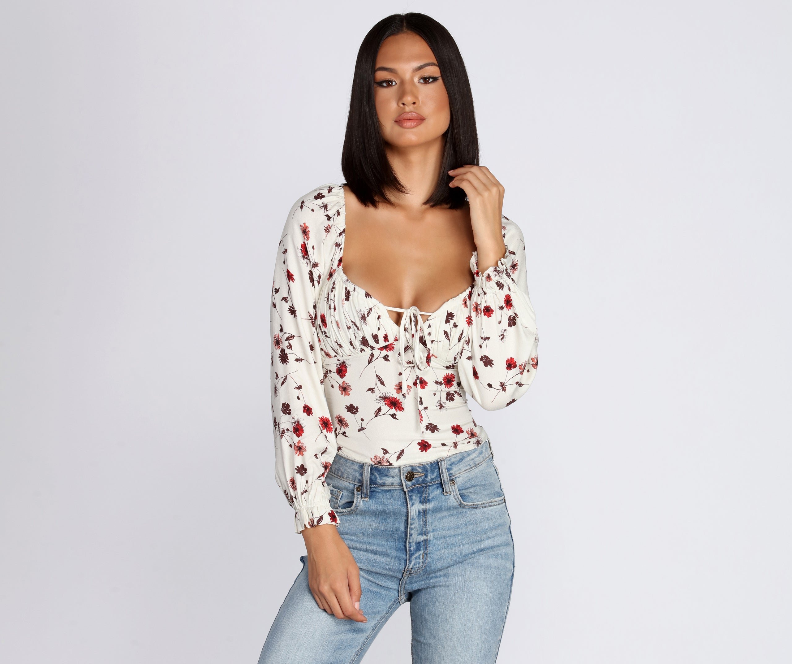 Get totally fall-ready with this pretty floral top. It features long sleeves with elastic banded ruffle cuffs, a sweetheart neckline with a keyhole cut out and tie front closure, pleated detailing along the bust, a scoop back, a hidden side zipper closure, and a mid-length, form-fitting style. The top is composed of a lightweight woven fabric with no stretch.