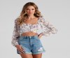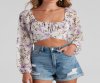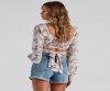 Fall for florals this spring! Create a cute look in this chiffon crop top featuring long peasant sleeves, a square neckline, and a cross-over hem with tie-back closure. Complete the look in denim