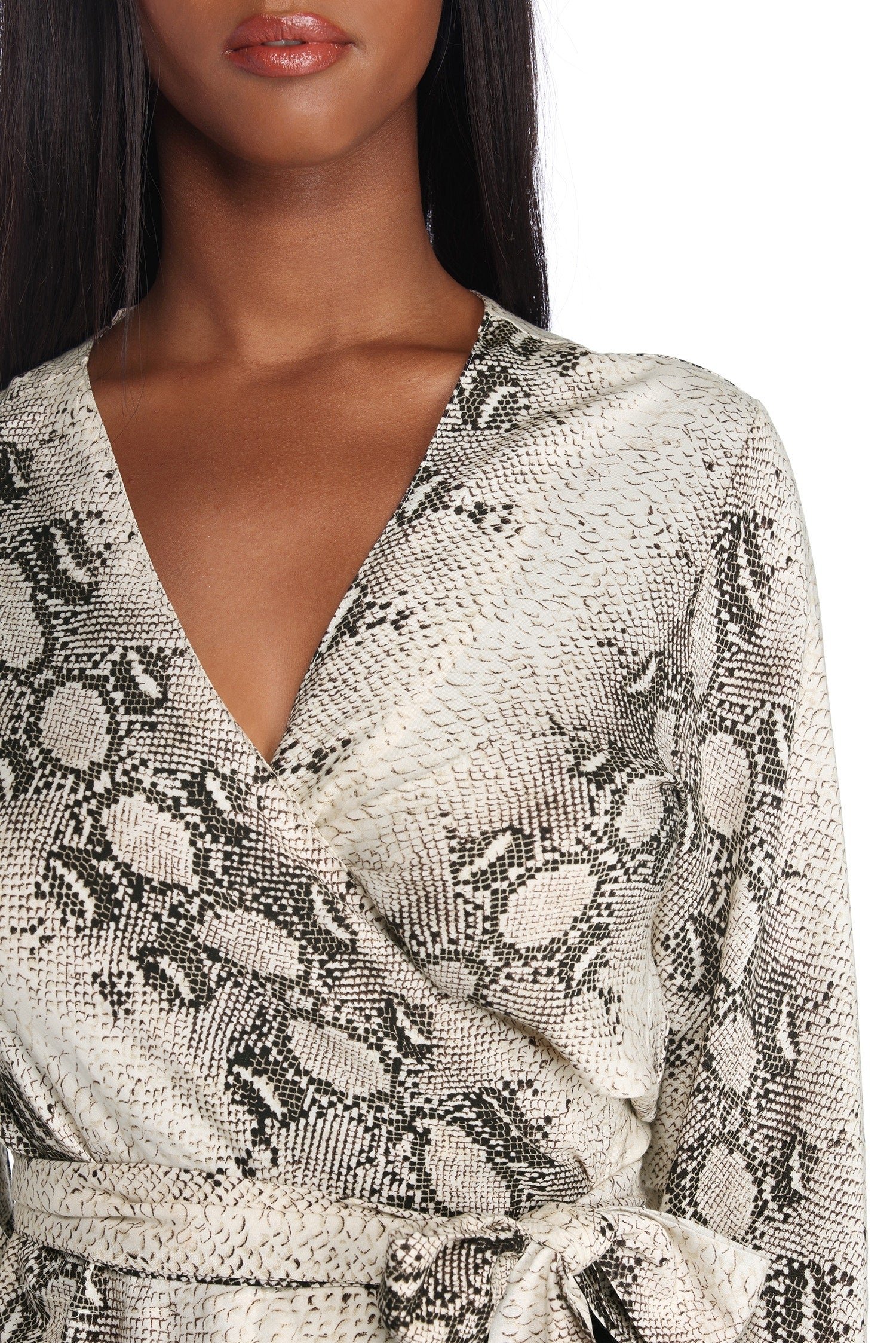This flattering snake print top will always be in style! It features a wrap bodice that ties at the waist, long sleeves, and a relaxed fit throughout. Top is composed of a smooth knit fabric.?