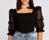 - Three quarter length sheer mesh sleeves with ruffle elastic banded hems