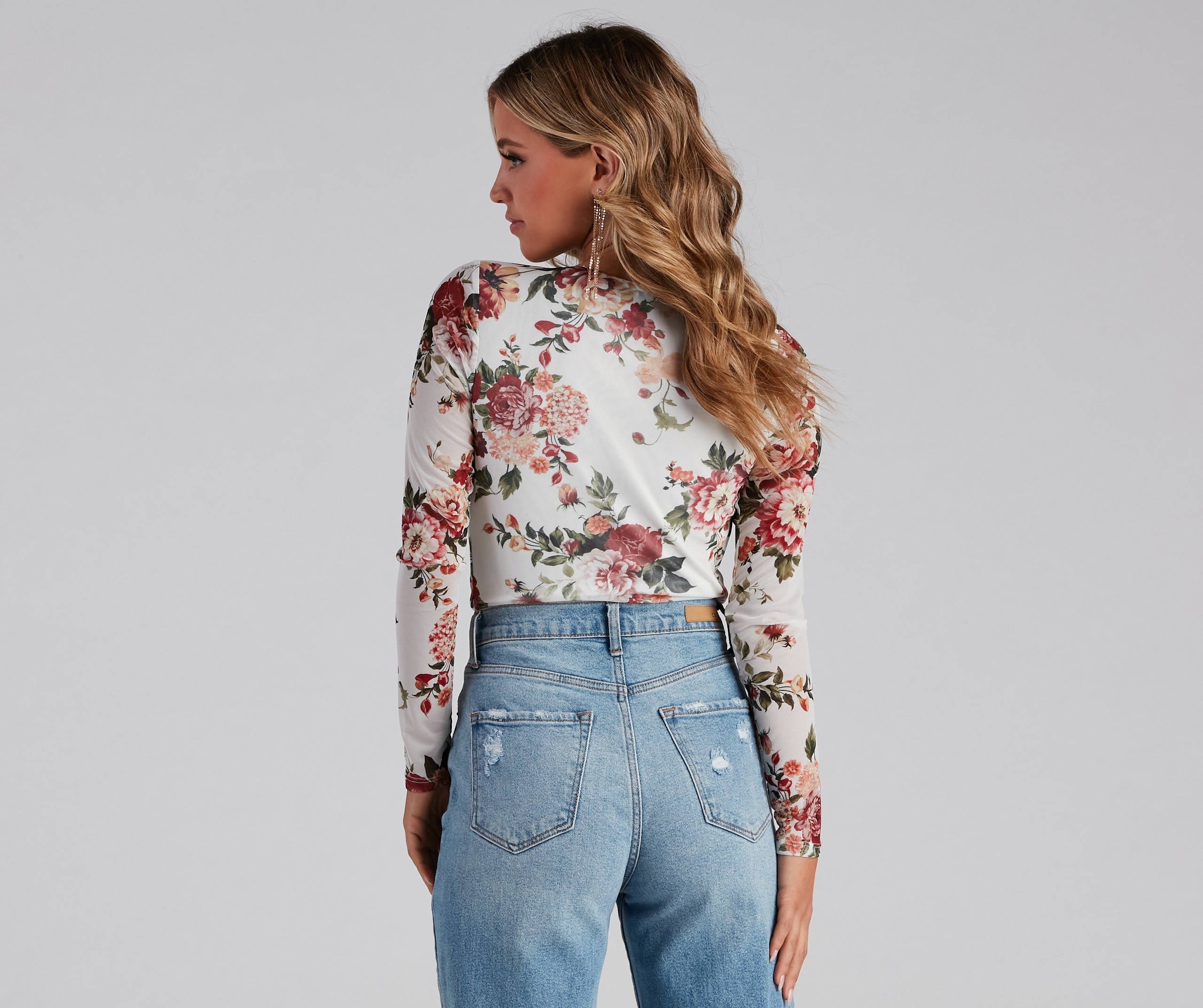 Fresh and blooming, this mesh floral bodysuit is a perfect addition to your spring lineup! It features long sleeves, a plunge surplice v-neckline, dual snap closure, and a thong bottom. Complete the look in trouser