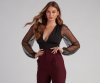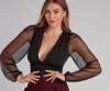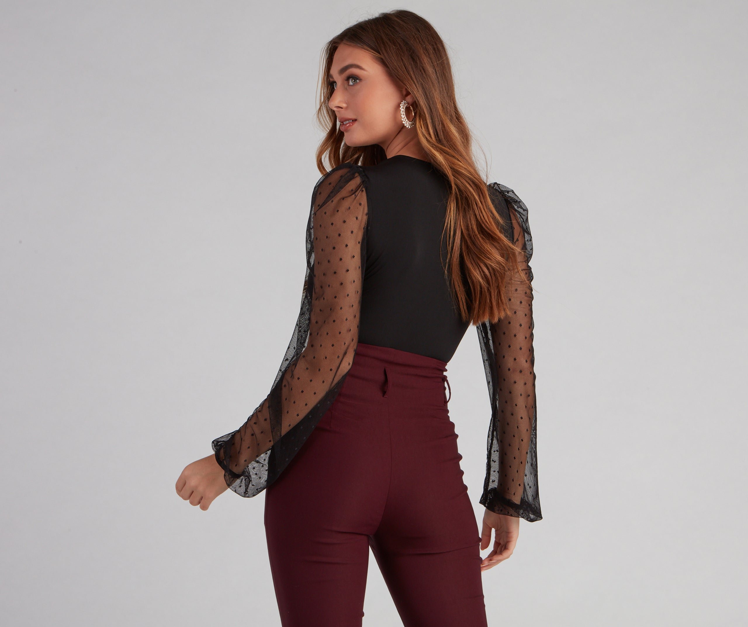 This bodysuit is all you need to create simple yet chic looks for day or night! It features puff mesh long sleeves with swiss dot detail and a plunging neckline. Style with