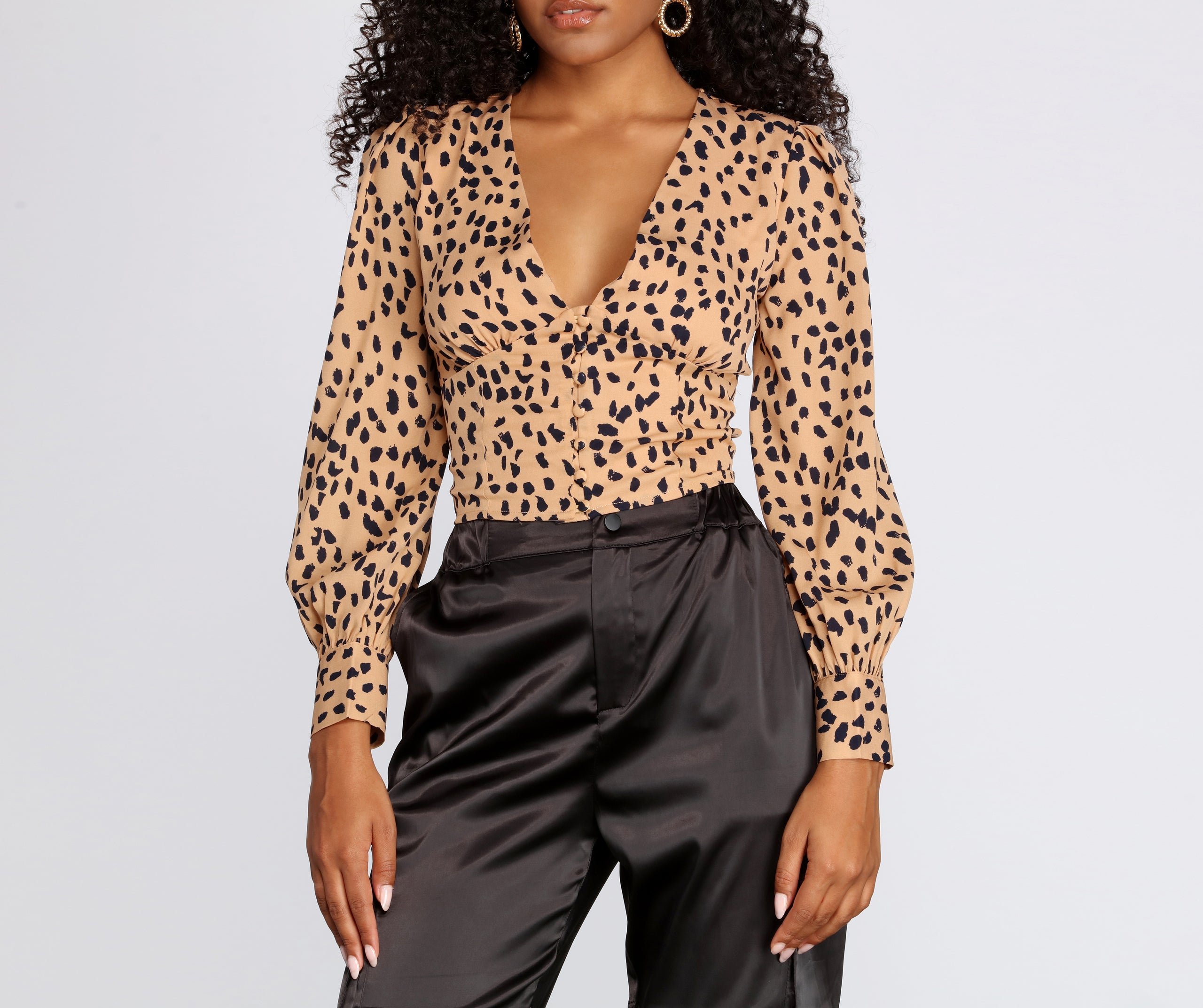Spotted! You in a chic and stylish printed blouse. It features long sleeves with double buttons to cuff, a V neckline, a button down front, and a cropped, fitted hem. The all over spotted animal print makes it purrfect for fall! Top is composed of a woven fabric with no stretch. Pair with your fave high waisted bottoms.