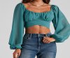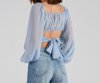 You'll look like such a daydream in this airy chiffon crop top! It features a subtle sweetheart neckline, a ruched bust, long sheer bishop sleeves, a cropped hem with a wrap-front detail, and a stylish tie-back design. Complete the look with cute denim and