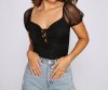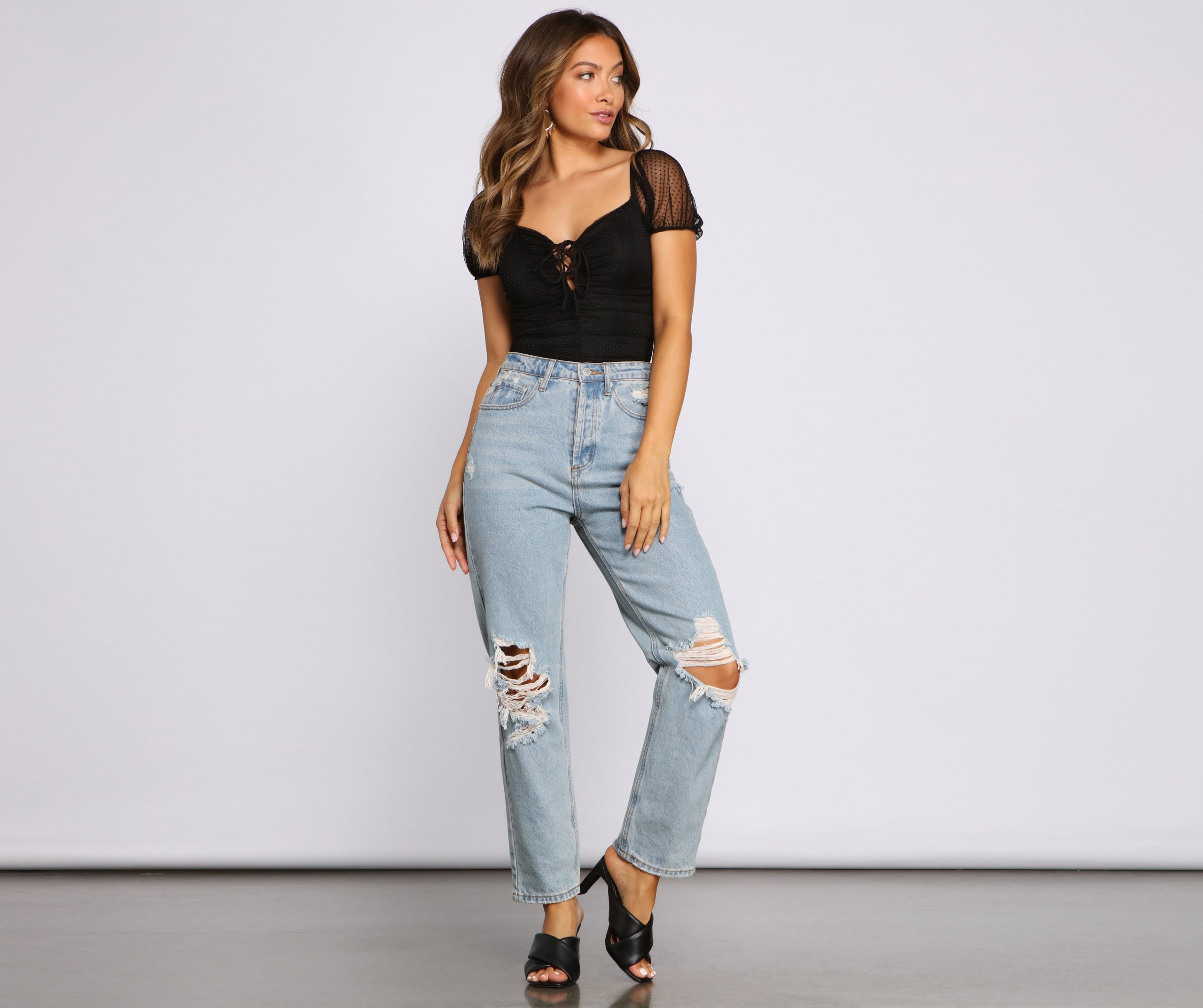 Show off your sweet side with this pretty bodysuit that brings charming details! The bodysuit features a sweetheart neckline, a lace-up front, short puff sleeves with a polka dot pattern, and a contrast bottom. Complete look with