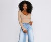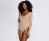 Rock a basic staple to pair with your favorite pieces! Bodysuit features a plunging V neckline, fitted long sleeves and a thong bottom with snap button closure. Bodysuit is composed of ribbed knit fabric that offers a form hugging fit with a moderate stretch.