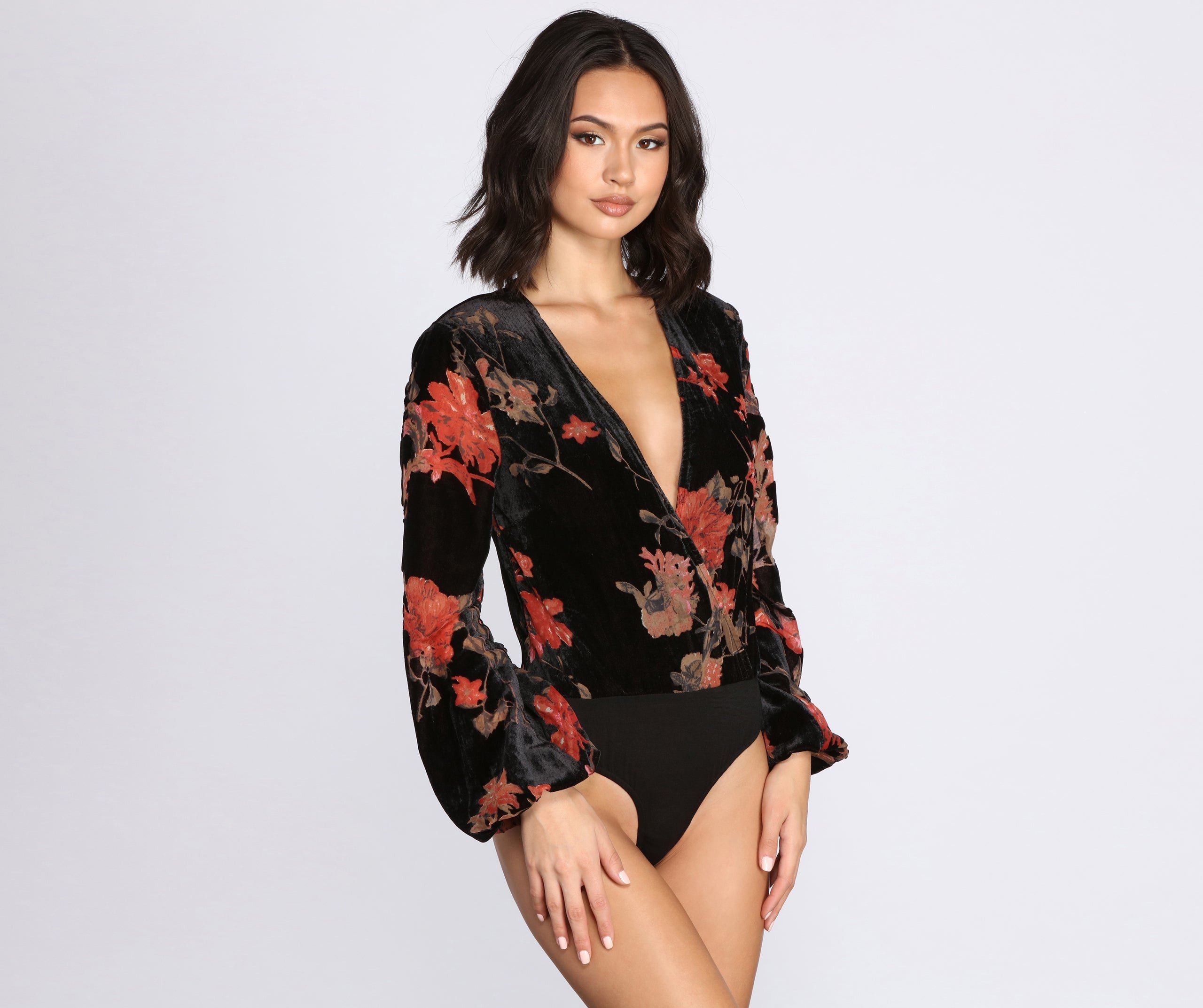 Add a touch of vintage elegance to your look! This velvet bodysuit is beautifully designed with a surplice V neckline and long sleeves that puff at the wrists. Bodysuit has a hidden zipper at the hip, and a thong bottom and a double snap closure, and is composed of a velvet material with floral mesh detailing throughout. Offering a light relaxed fit, and moderate stretch, and a full frontal lining, this floral bodysuit has become one of our new faves!
