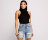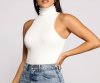! The bodysuit features a mock neck, a sleeveless bodice, and composed of a retentive crepe knit fabric that offers a moderate stretch.?