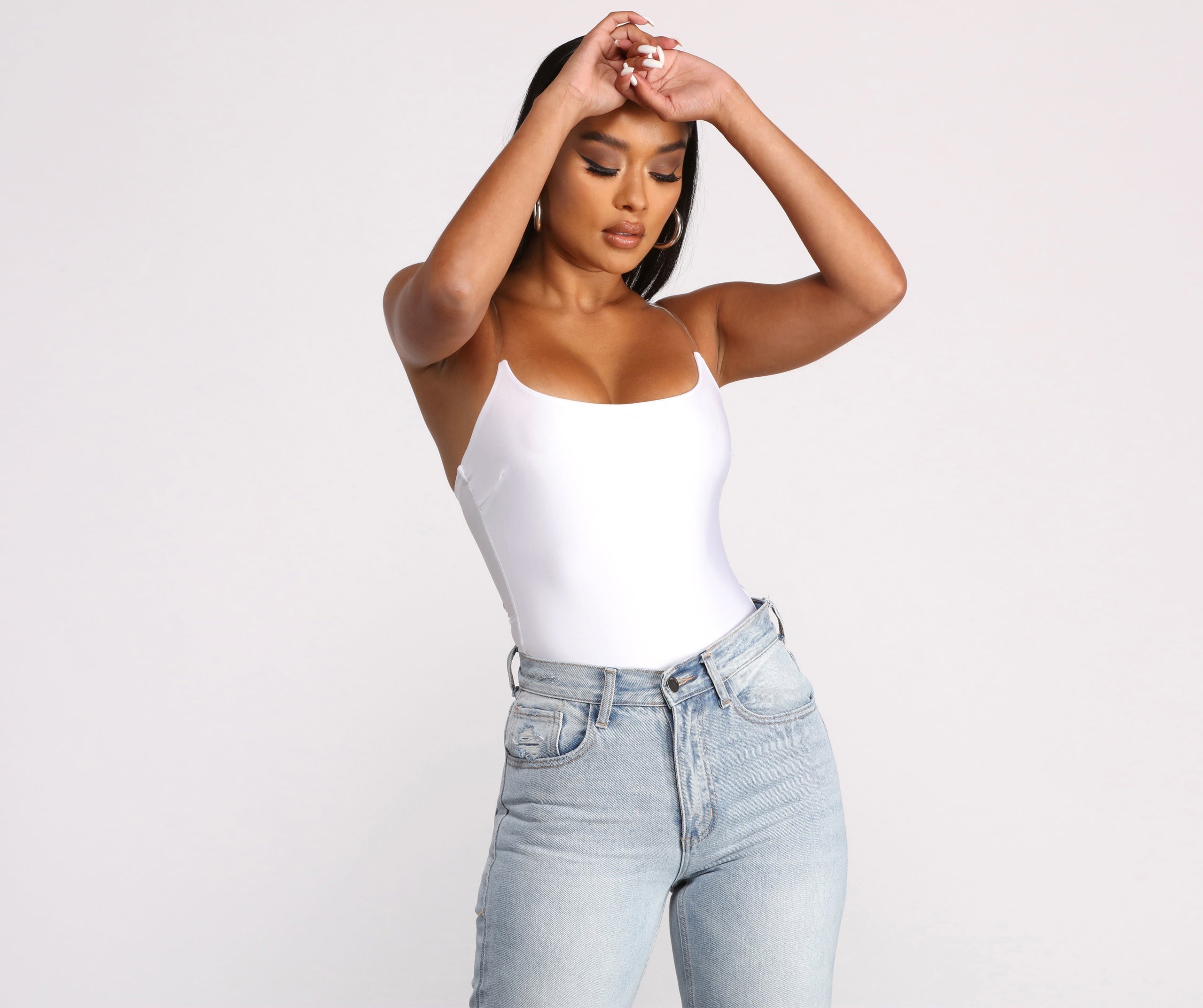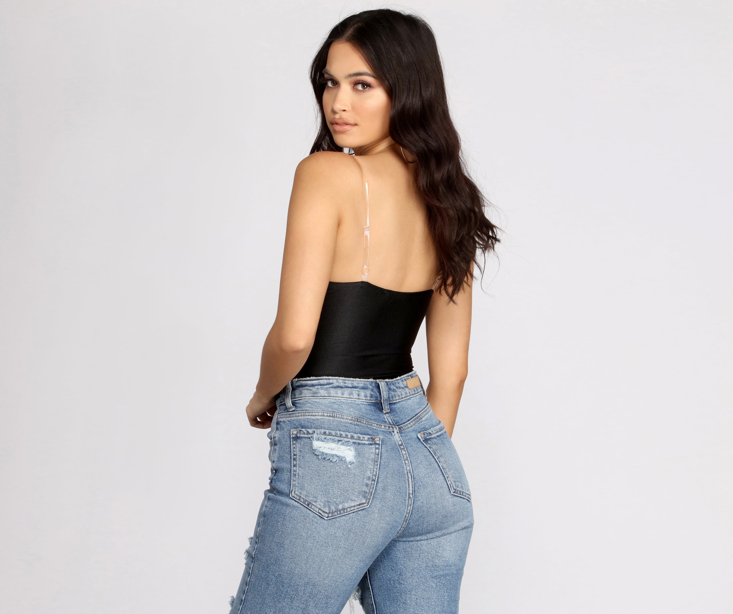 You'll be on-trend in a knit bodysuit. The simply stunning features a slightly rounded neckline, dart seam detailing and clear adjustable spaghetti straps. The bodysuit includes a cheeky bottom with dual snap button closure.? The stretchy knit fabric offers a form hugging fit. Complete your outfit with flattering