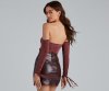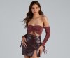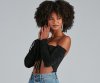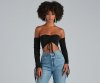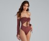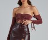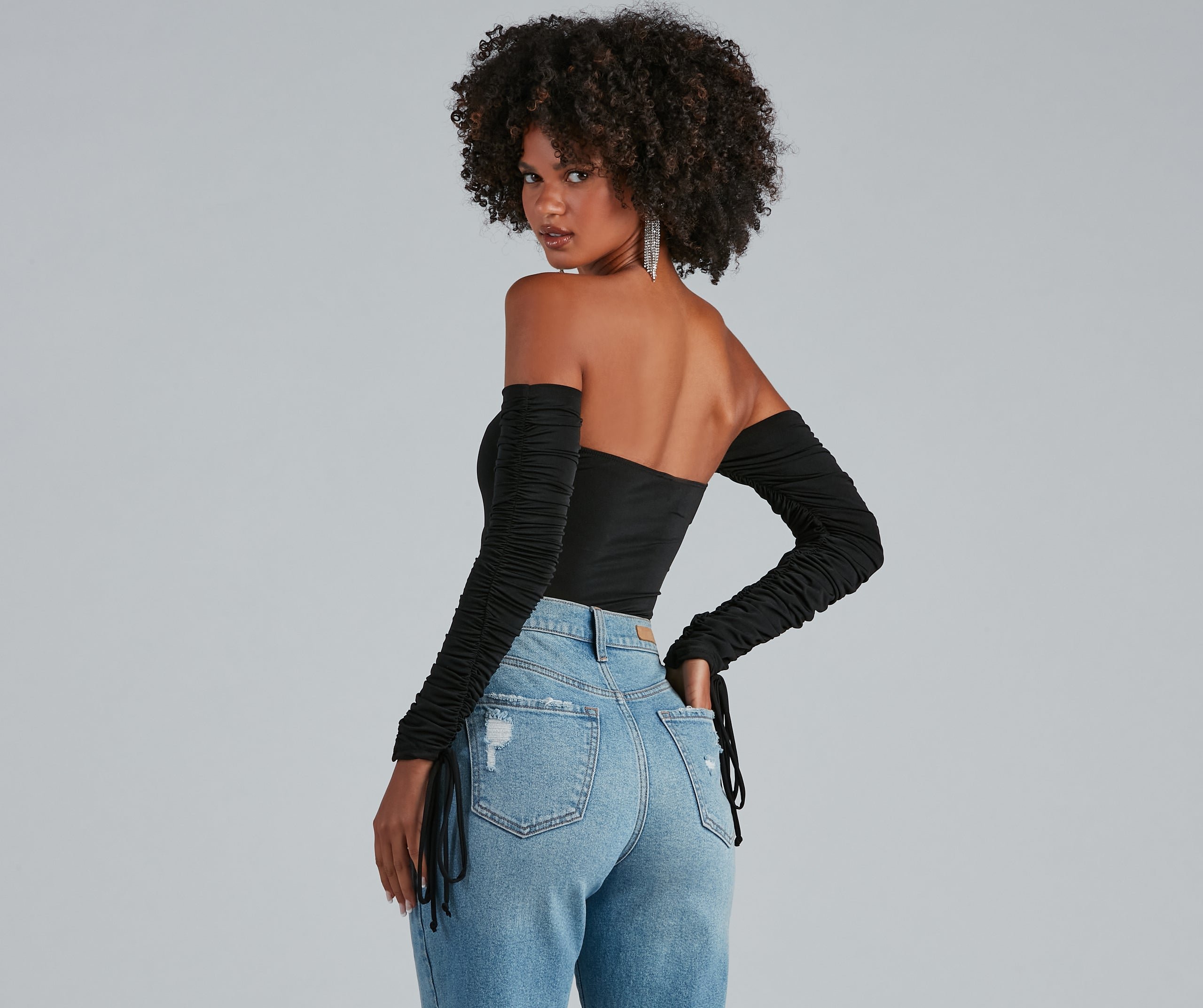 Kiss your new fave bodysuit hello! It features eye-catching Venetia ruche-styled long sleeves with tie, an off-the-shoulder neck, ruched bust with adjustable tie, a cutout bodice, and a dual snap closure on the thong cut bottom. Composed of a subtle sheen knit fabric with a moderate stretch. Style with cute boyfriend