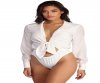This white bodysuit??is sophisticated by day, and can turn sexy by night! This versatile top has an open front with a tie front detail at the hem, a fold over collar, and a relaxed fit. Bodysuit?is composed of a satin-like fabric. Includes a thong bottom with snap button closure.