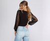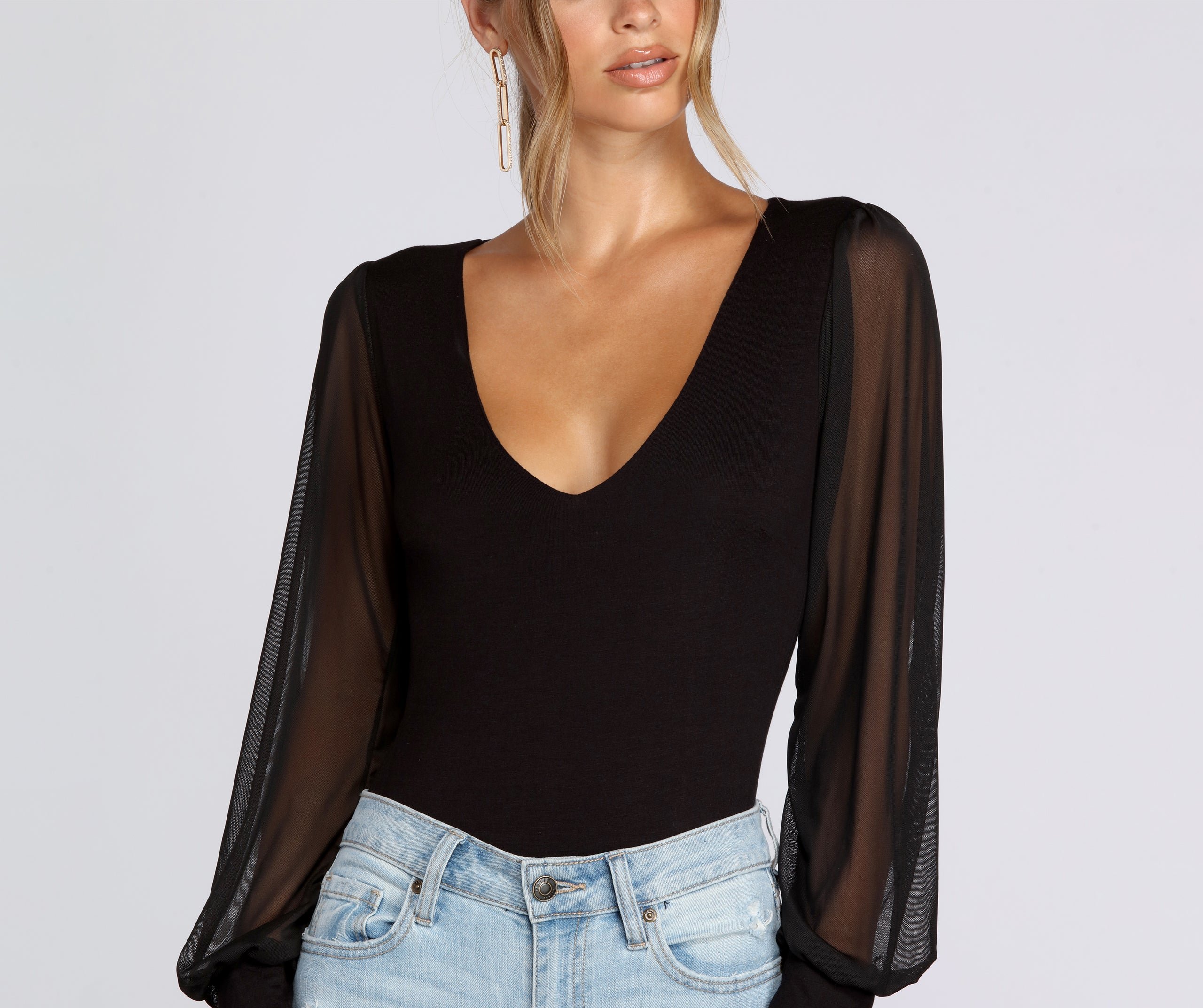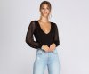 As practical as it is chic, this mesh and jersey bodysuit will work around the clock! It features a plunging V neck, long, sheer cuffed sleeves, dart detail at bust, a thong-style bottom, and double snap-button closure. Bodysuit is made from a rayon blend with moderate stretch.