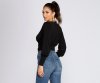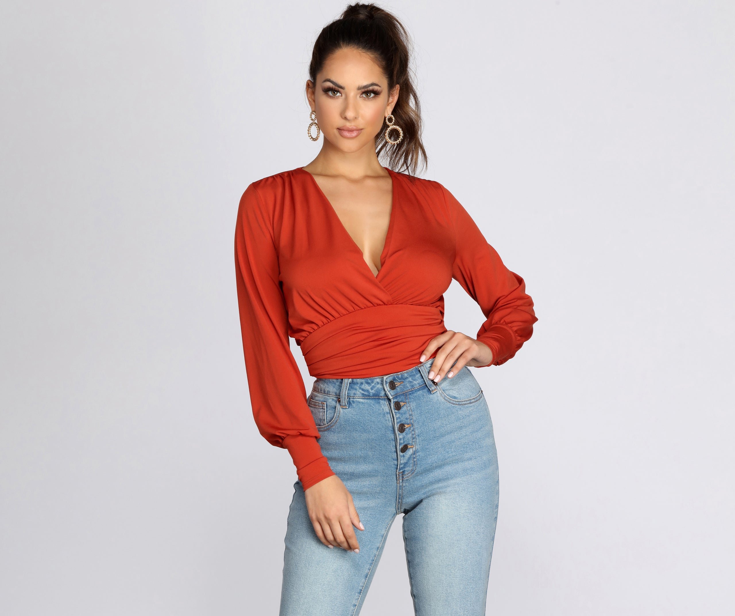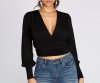 Designed to give you that girl next door vibe, this lightweight and flowy top is sweet and flirty! Featuring a v neckline, long dolman style sleeves, and a surplice bodice. Top has a banded waist line that is slightly cropped hitting mid waist and is composed of a poly knit material that offers a form fit with lots of stretch. Pair with high waist denim for a casual flirty vibe!