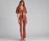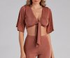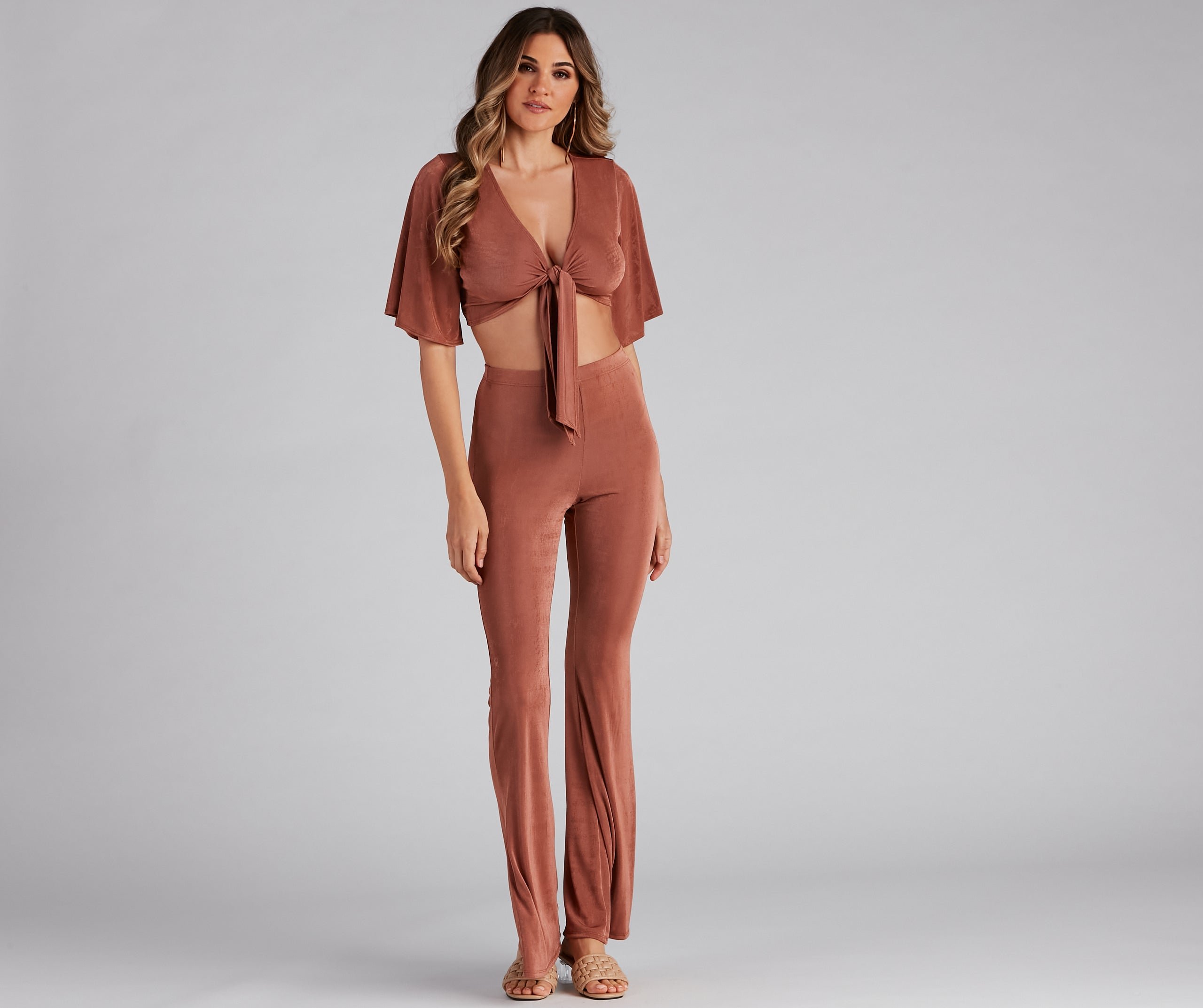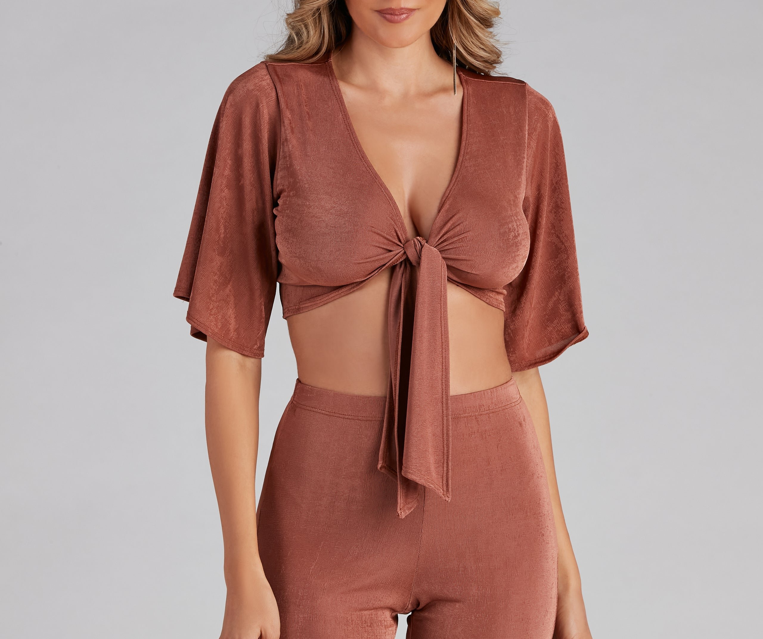 Create a flirty vibe in this flowy 3/4 sleeve crop top featuring a plunge v-neck with a tie-front on slinky knit fabric. Complete the look in the matching bottoms.