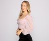 Bring on the glitz with a crop top that is perfect for your next date night. The top features a sweetheart neckline with padded cups, a ruched bodice, long puff sleeves, and a cropped hem. The top is composed of a glitter lurex knit fabric that offers a form hugging fit with a moderate stretch. Complete your outfit with a