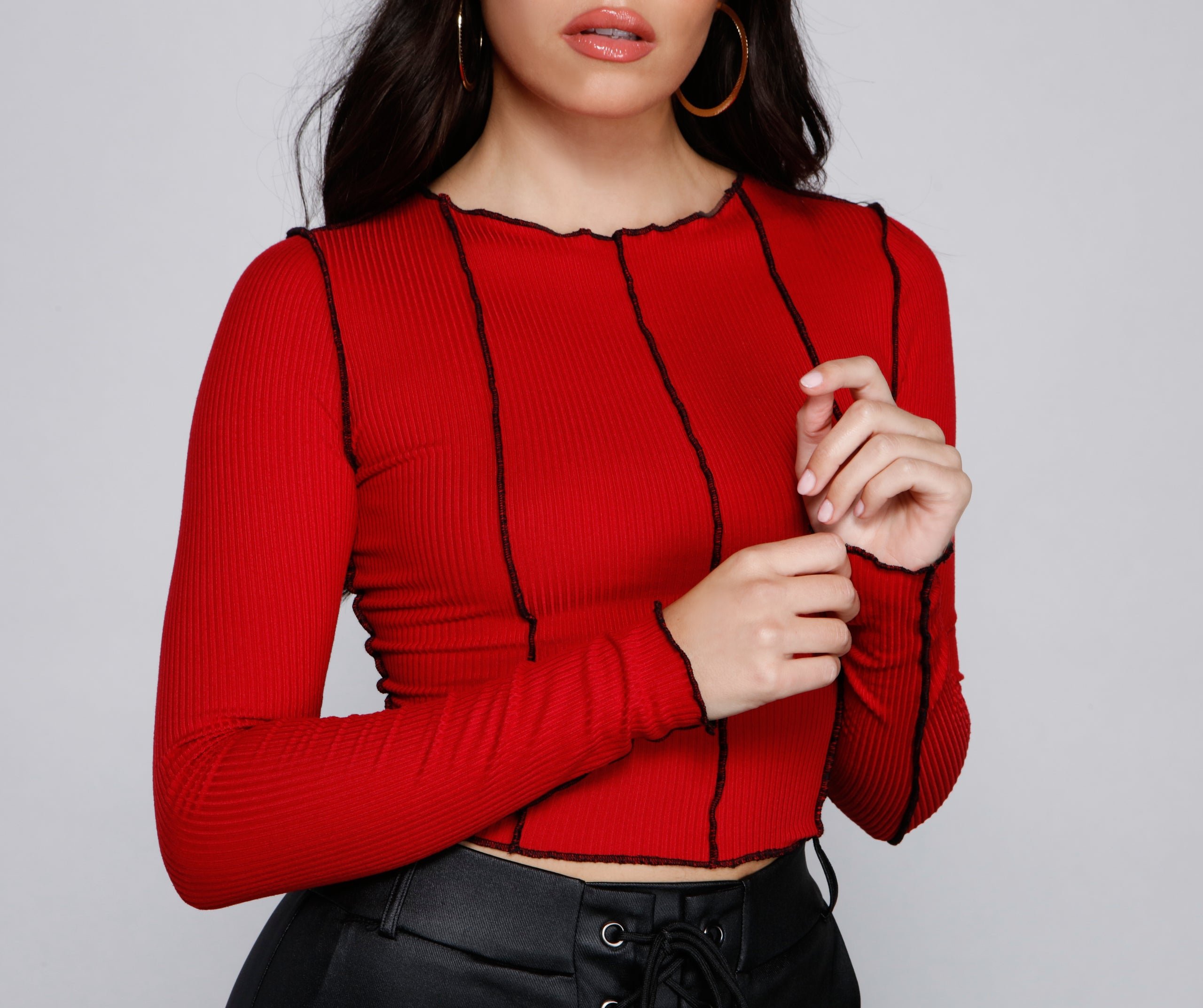 Keep your casual look on-trend with this cute long sleeve crop top. It features a crew neckline, a cropped, form-hugging fit, and is composed of a lightweight stretchy ribbed knit fabric with contrasting exposed seams. Style this top with