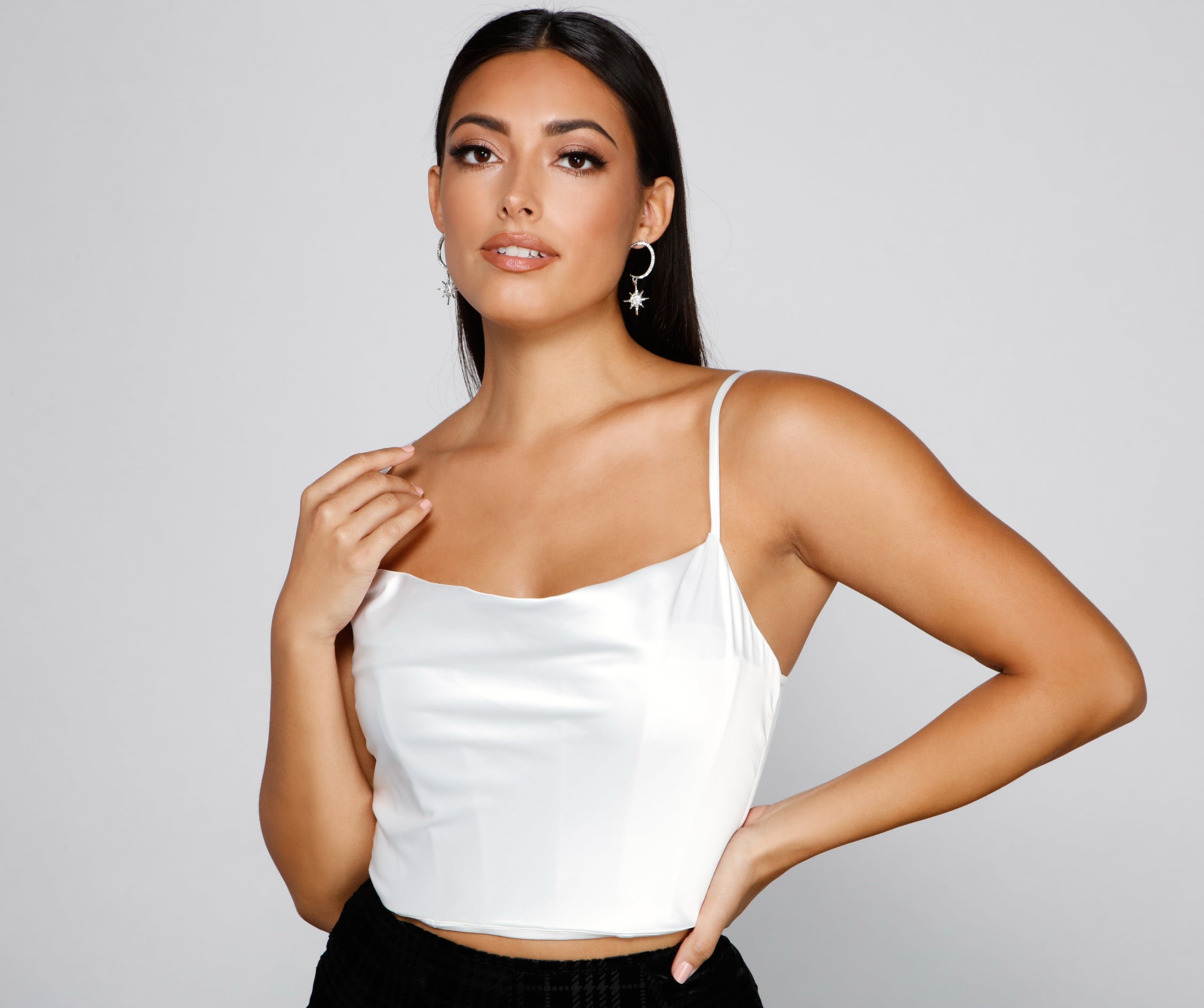 A satin top as chic as this deserves all the love! It features sleek adjustable spaghetti straps, a cowl neckline, and a structured bodice with zipper closure. Complete the look in flared