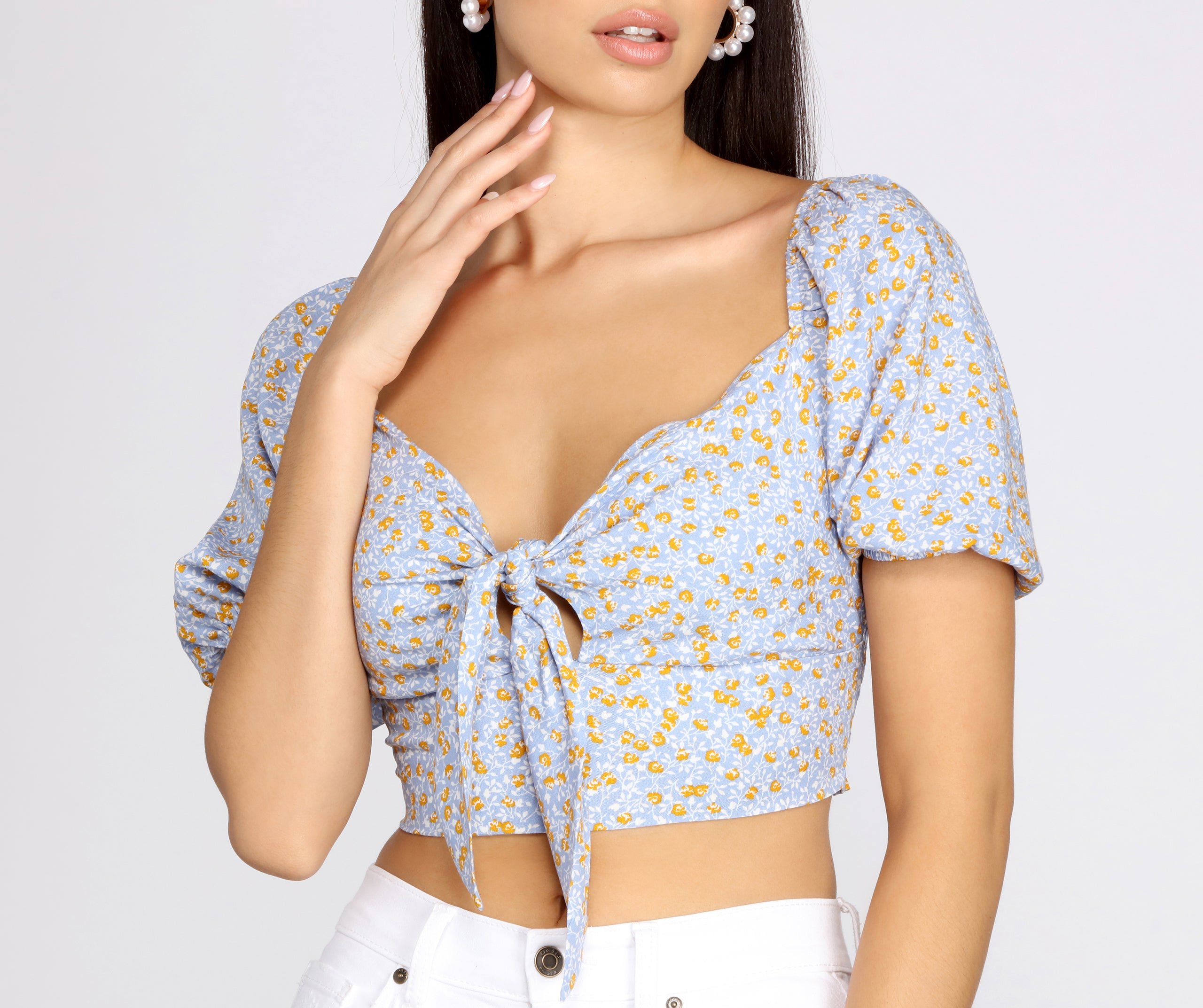 Style yourself with spring in mind! This ever so floral cropped top is a sunny day essential. Pair with white high waist denim, or even a mini skirt!