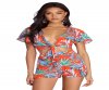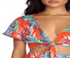 Who likes to vacay? We do! Get those relaxing vibes going in this tropical-inspired top! It features a red hue, a plunging knotted bodice, short sleeves and a cropped hem. The all over palm leaf print features green and blue hues. Top is composed of a lightweight unlined woven fabric that offers a relaxed fit with minimal stretch. Be sure to pick up the matching shorts!?