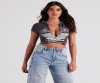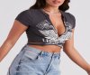 Bring the biker vibes to your everyday look with this trendy graphic tee! It features a crew neckline with a V-cut design, short sleeves, a motorcycle and wings graphic with the script, "Iron Wheel, "Wing Of Victory," "Legendary Riders," and "American Motorcycles," and a fitted, cropped hem with a tie-front design. The cotton-blend fabric offers a moderate stretch. Style with a