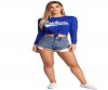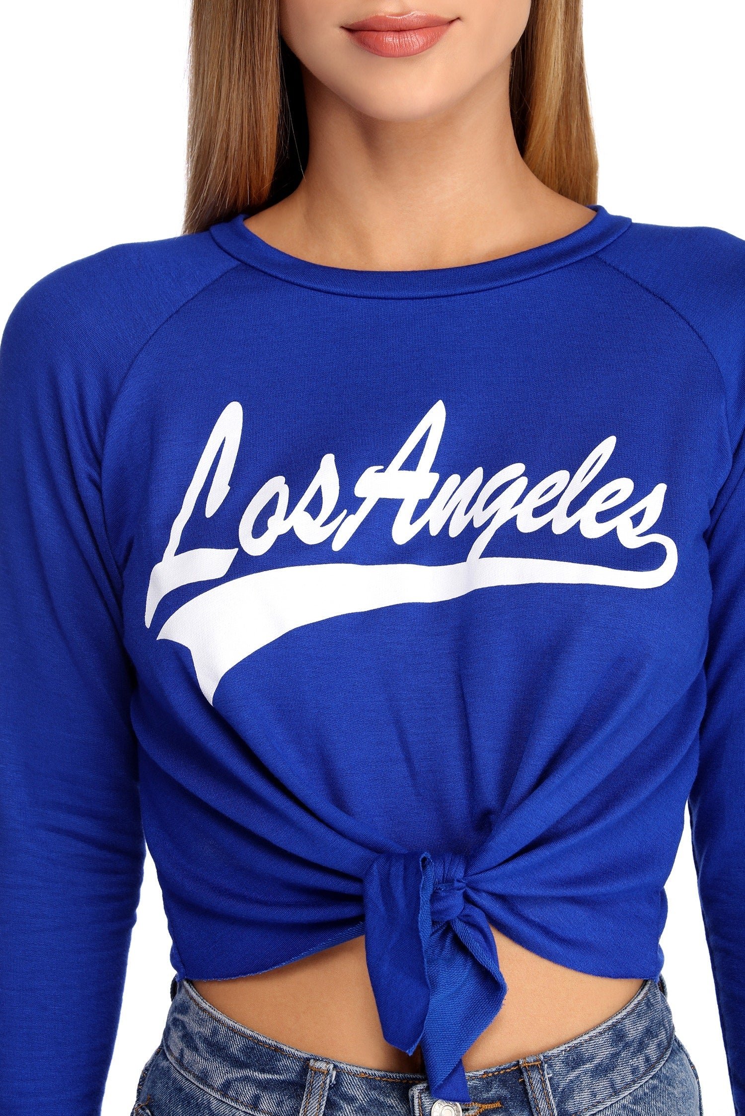 Make the crowd go wild in this winning sporty tee! It features a royal blue color, a round neckline, a knotted hem, long sleeves and a graphic that reads: "Los Angeles" in a contrasting white script. Tee is composed of a soft knit fabric that offers a relaxed fit with a moderate stretch. ?