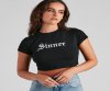 Flaunt your bad girl status in this graphic crop top for Halloween fun! It features a crew neck, cap sleeves, and a front script that reads, "Sinner" along the fitted bodice on cotton fabric. Complete the look in new