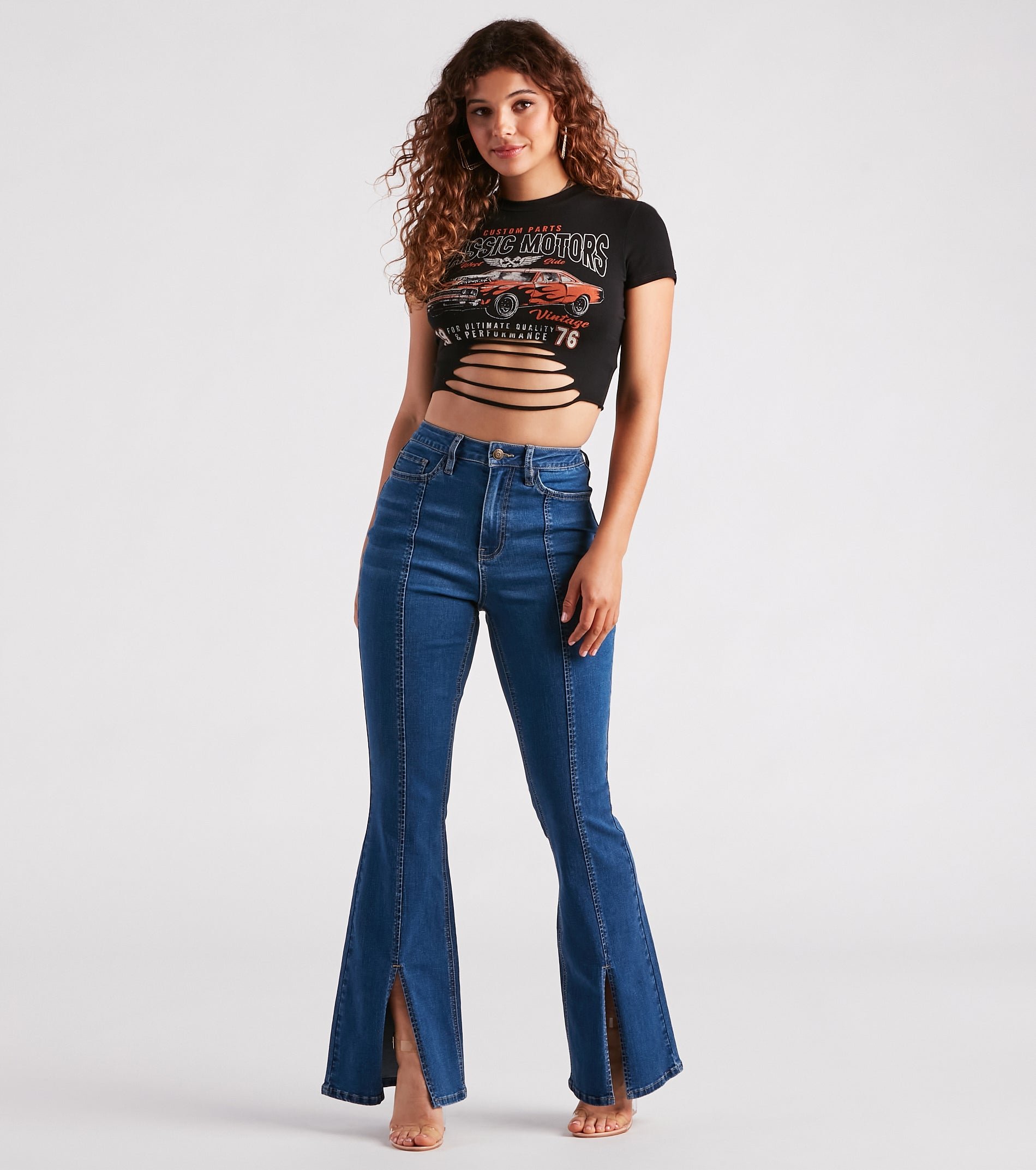 Start your engines and rev up in edgy style by showcasing this graphic crop tee! It features short sleeves, a crew neck, a front graphic with "Custom Parts Classic Motors" and a slashed cropped hem. Complete the look in trendy