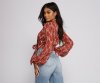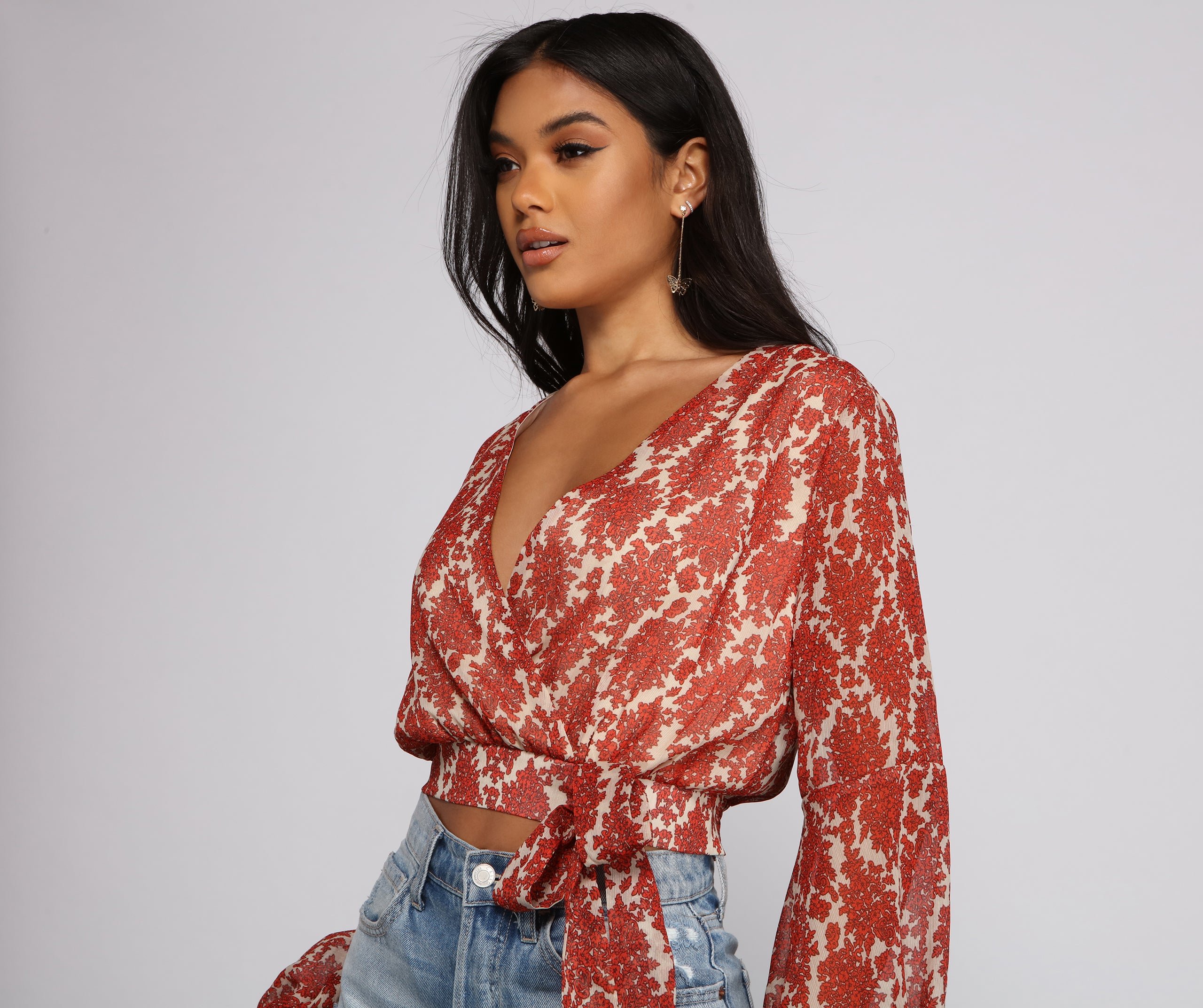 ! It features a flattering wrap front and tie front detail, along with a gorgeous floral print to bring on the autumn vibes. Wear this top to happy hour with your girls.