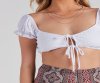 Bring the flirtatious vibes in this eyelet crop top featuring adorable puff sleeves, a scoop neck, and dual tie-front closures. Complete the look in boho-inspired flare