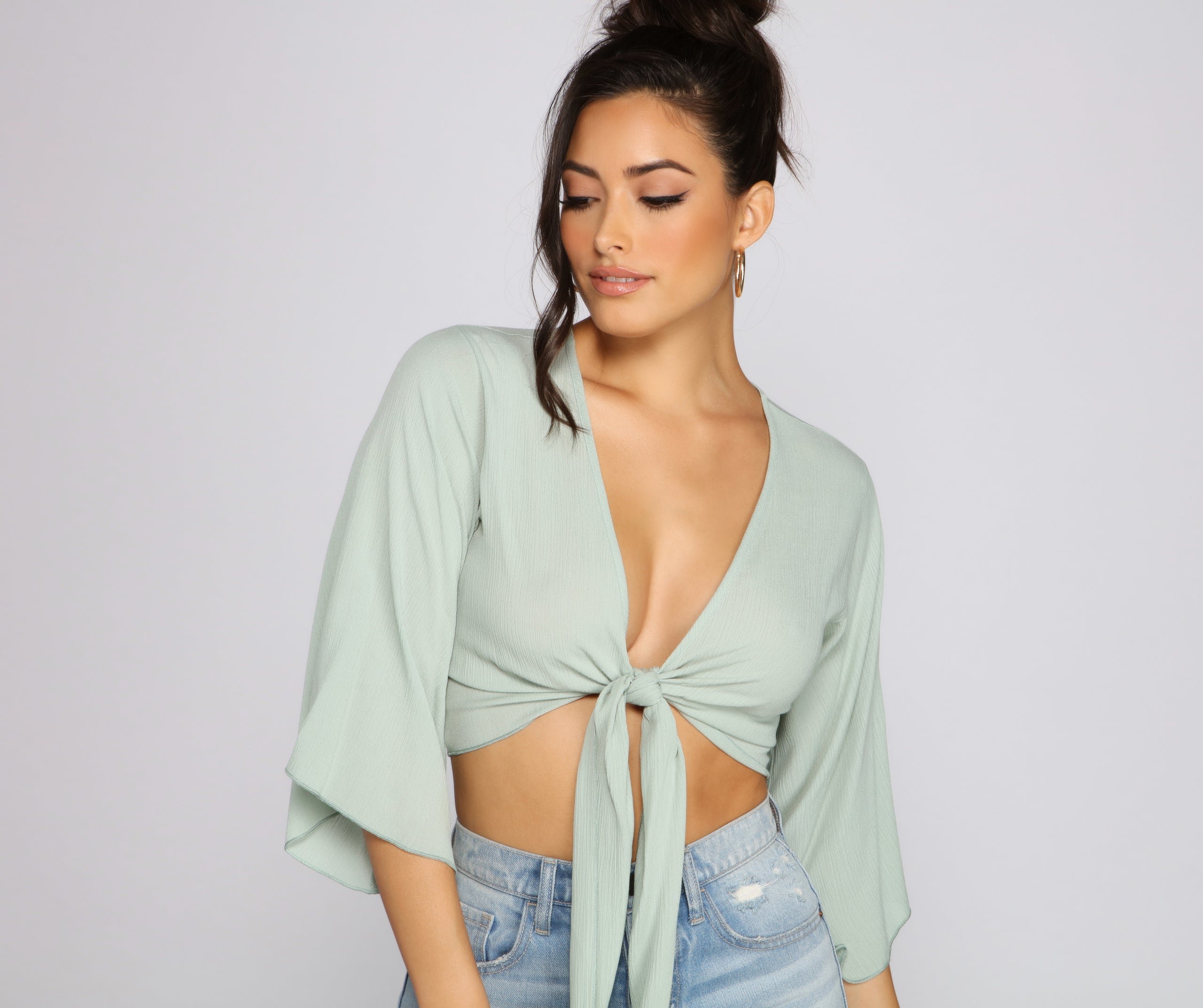 Gaze on this adorable top that brings the charm! It features a plunging tie front, quarter-length kimono-styled sleeves, and a cropped hem. The top is composed of a lightweight gauze knit fabric that offers a form hugging fit with minimal stretch. Complete look with