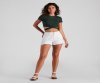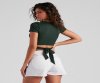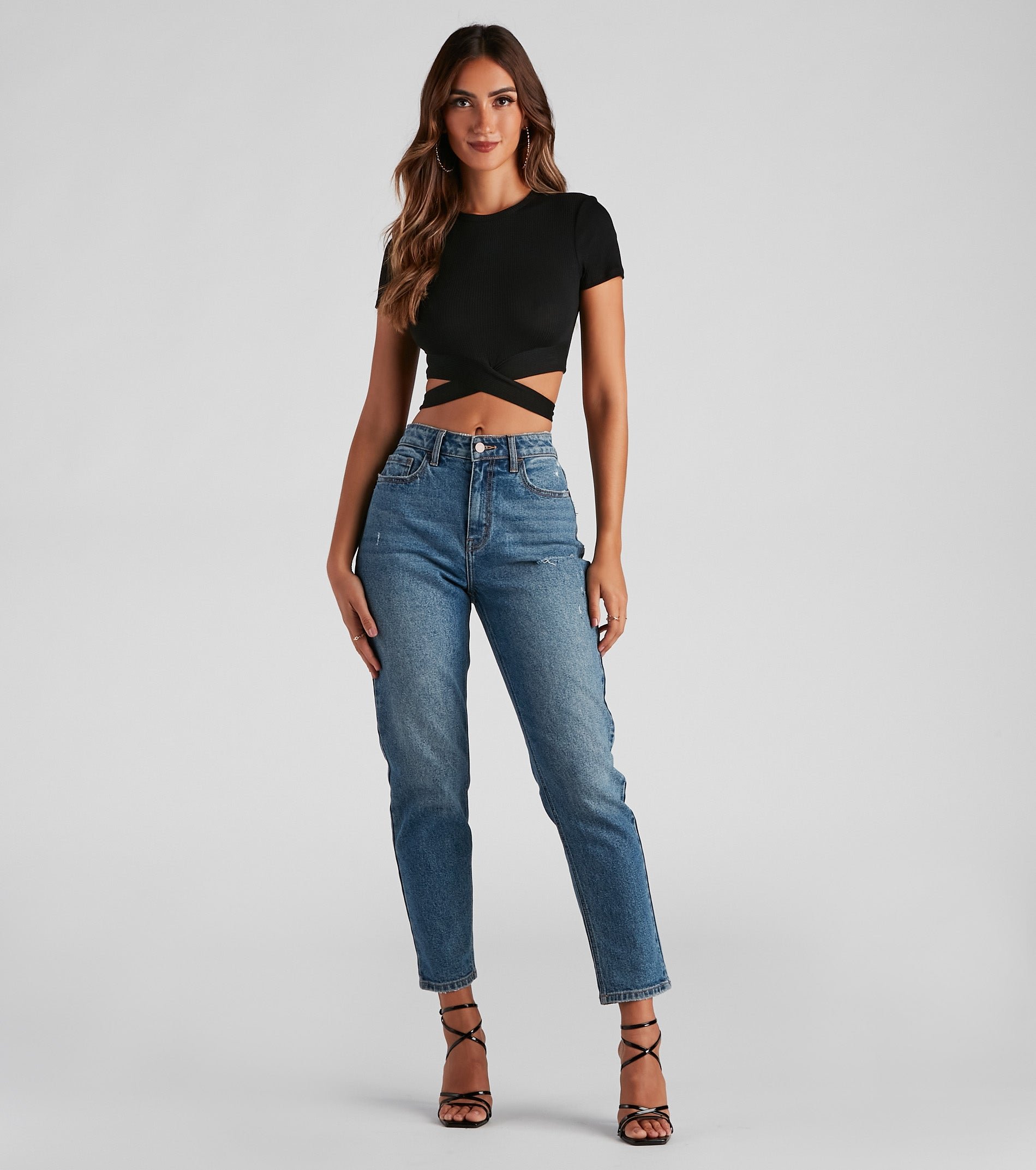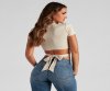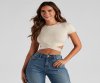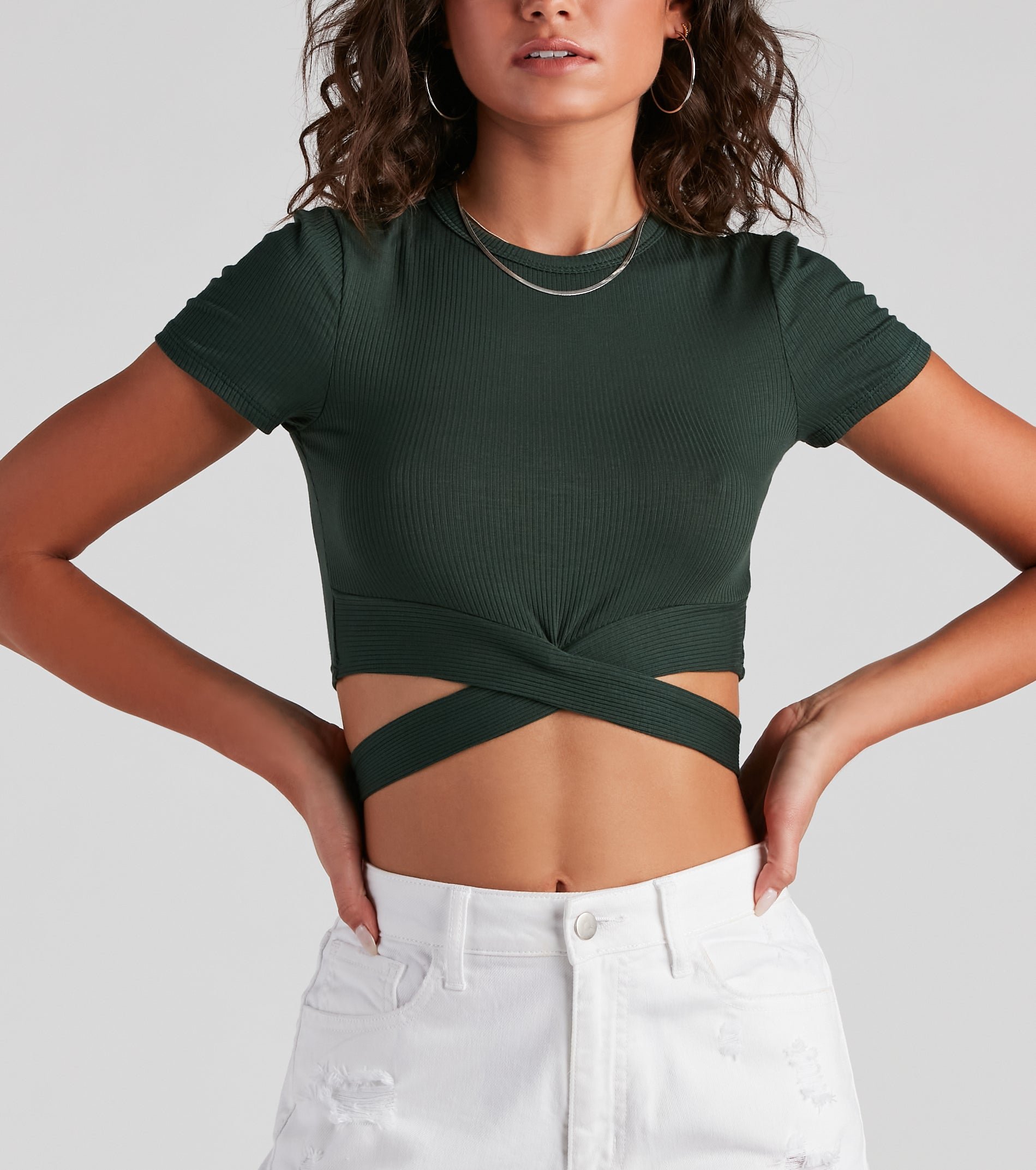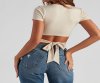 Your outfit of the day will slay in this crew neck tee featuring short sleeves and a wrap-tie cropped hem on stretchy, rib-knit fabric. Complete your trendy look in mid-rise