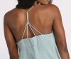 Keep it casual in a trendy cami top. This top features a sleeveless bodice, a v-neckline, spaghetti straps and an open back with a twisted bar strap accent. The top is composed of a lightweight woven fabric that offers a relaxed fit with a slight stretch. Complete your look with a pair of