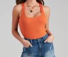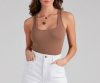 Bring your look back to basics with a bodysuit that is perfect for nailing that lowkey look this season. This sleeveless bodysuit features a square neckline, tank shoulder straps, and a trendy racerback with a lower back cutout on lined rib-knit fabric. Complete look with