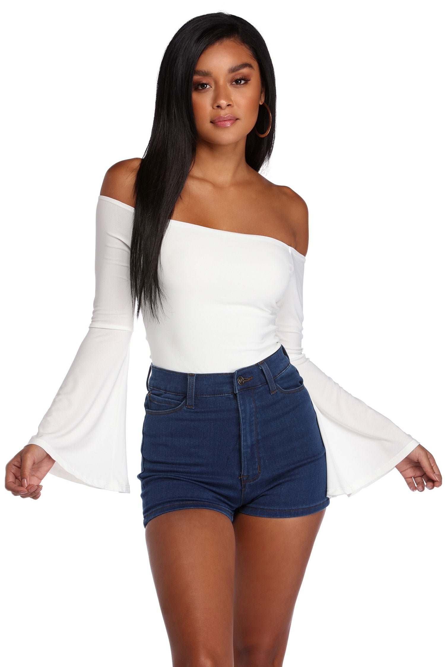 Do it for the bell of it! This cute top has an off the shoulder neckline paired with long, bell sleeves and a thong bottom with a snap button closure. The garment is composed of a smooth knit that offers decent amount of stretch.