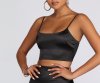 You fancy, huh? Don't miss out on this satiny cropped cami with stretch shoulder straps and an elasticized back. Piece is partially lined and made of a stretchy polyester blend that fits to your form. Complete the set with the matching mini skirt!