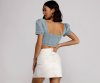 Channel good vibes in a cute crop top that showcases your on-point style this season. The crop top features a plunging sweetheart neckline, short puff sleeves, a zip-up front, and a light wash denim. Complete outfit with