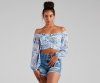 One look at you in this corset top will have them falling in love! The top features a pretty floral print, an off-the-shoulder neckline with ruffled trim, long sleeves, a hook and eye front closure, and a cropped hem. The top is composed of a lined chiffon fabric that offers a form hugging fit with minimal stretch. Complete look with a