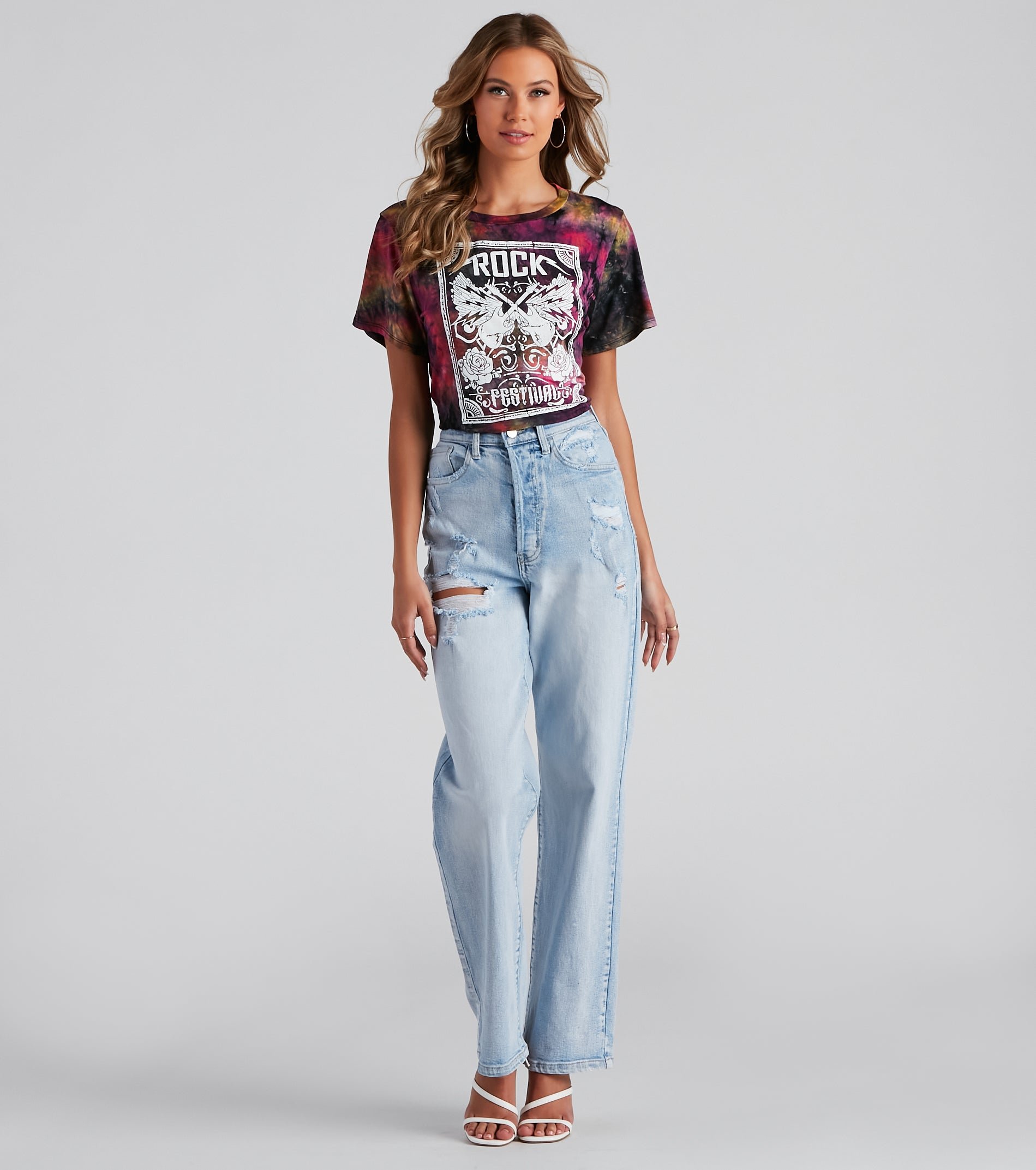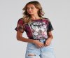 Step up your casual edgy look with this trendy cropped graphic tee. It features a crew neckline, loose short sleeves, a cropped relaxed fit, and a center contrasting guitar, wings, and rose graphic with the script "Rock Festival." Style this tee with distressed vintage-inspired