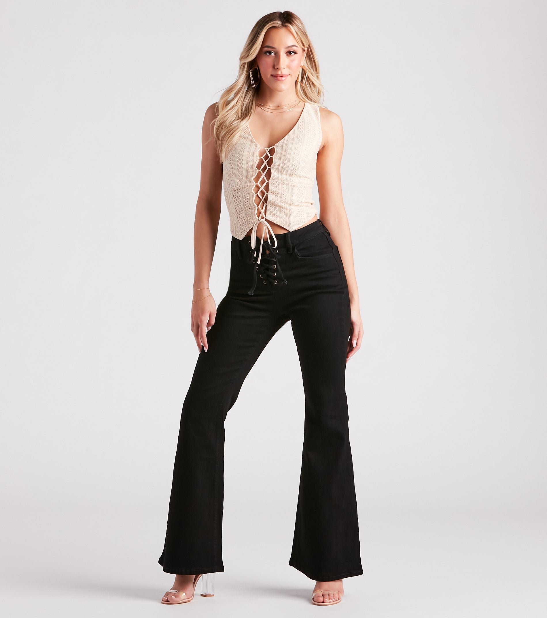 Feel the rhythm in this crochet vest perfect for festivals or concerts! It features a sleeveless V-neckline, wide shoulder straps, a front lace-up design, and a pointed crop hem. Complete the look in trendy