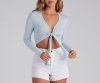 This tie-front top is definitely a keeper! It features long sleeves, a plunge v-neckline with a tied crop hem. Composed of stretchy soft knit fabric. Style with denim