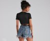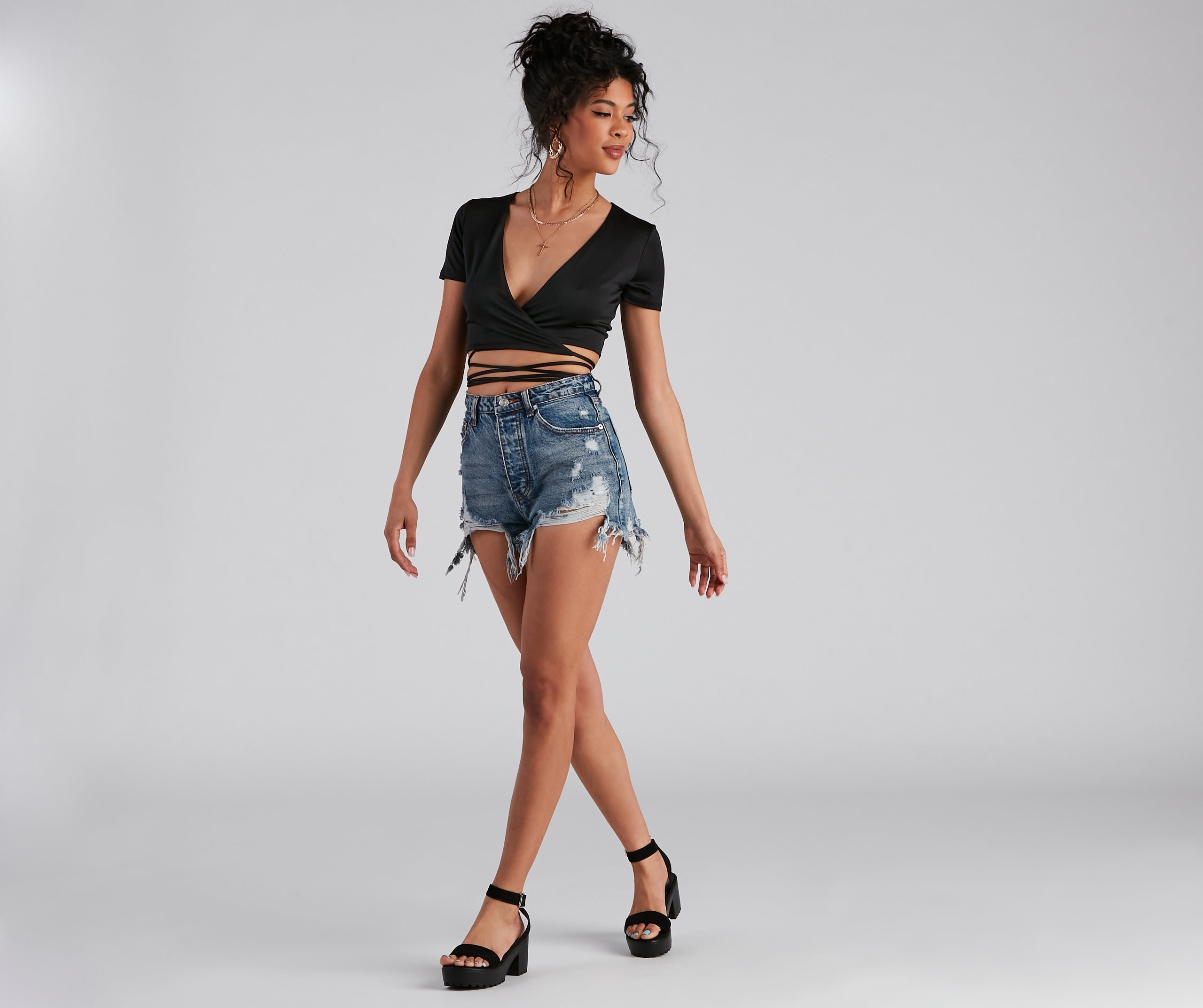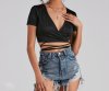 The prettiest wrap crop top you've ever seen! It features short sleeves, a V-neckline, and a wrap tie-waist on sleek knit fabric with a moderate stretch. Complete the look with jeans and