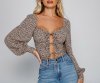 Reign your look with a fierce top that brings those bold details! The top features a fierce animal print, a sweetheart neckline, no-slip strip, long sleeves, and a double row of tie-front ties. The top is composed of a lightweight woven fabric that offers a form hugging fit with minimal stretch. Complete look with high waist leggings and