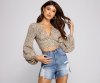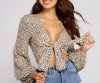 Bring a sassy style to your everyday look with this on-trend cheetah print top! It features long blouson sleeves, a V neckline, a tie detail that can be worn in the front or the back, and a cropped hem. Pair this top with