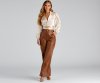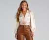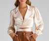 The satin top of your dreams is here and accessorized! It features long peasant sleeves, a collared neckline with a chainlink necklace accent, and a tie-waist detail. Complete the look in