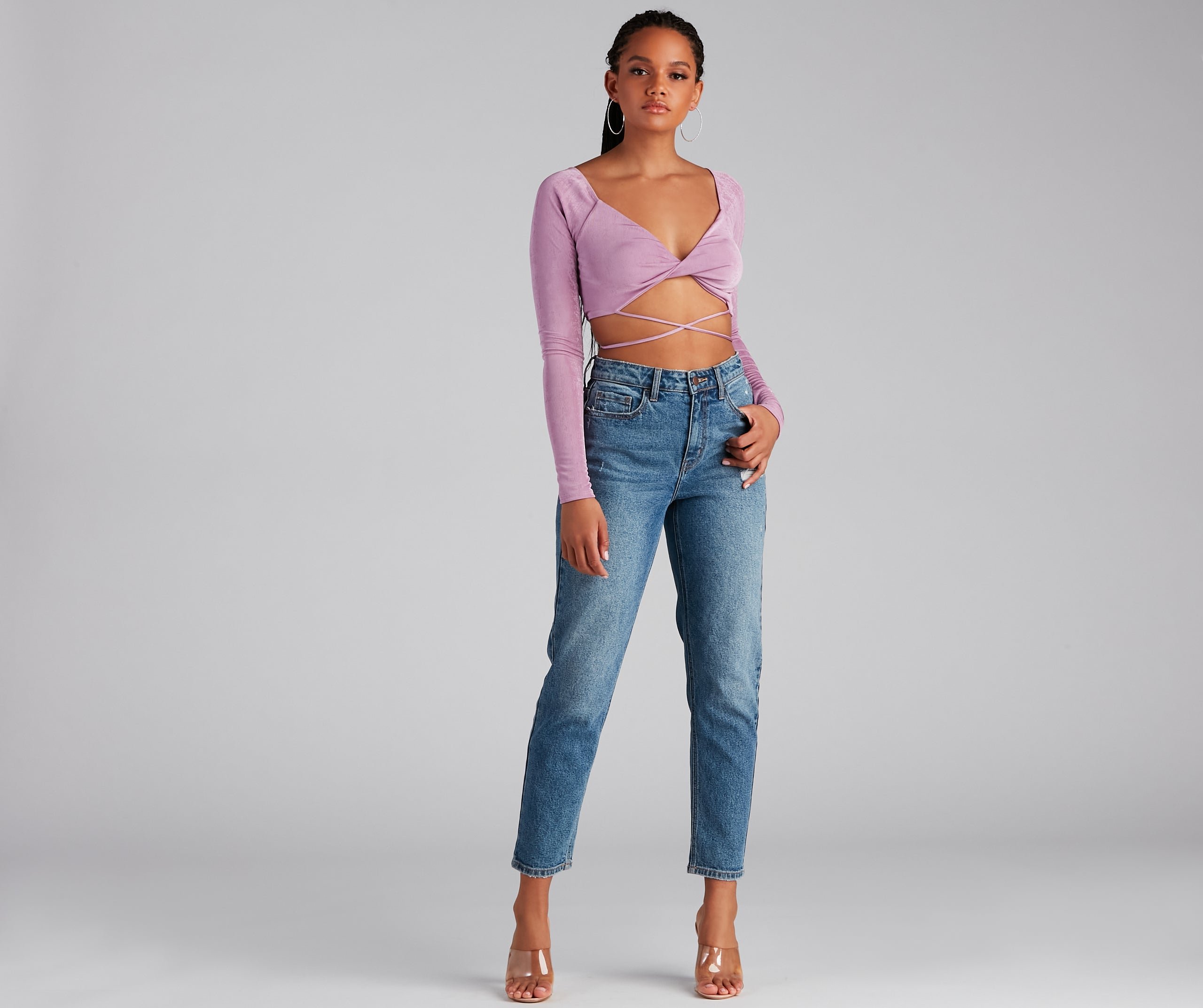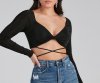 Flaunt your fashionista status in this cute wrap crop top featuring long sleeves, a plunge V-neck, and a twist front with a wrap-tie closure. Composed of slinky knit fabric with a moderate stretch. Complete the look in